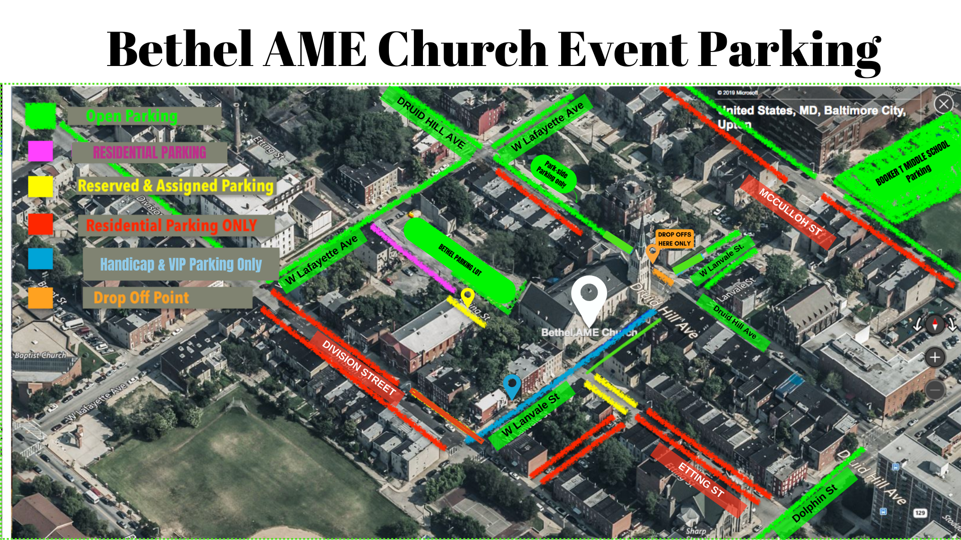 Bethel AME Church is located at 1300 Druid Hill Ave in the Upton / Marble Hill Communities. Please review the color coded map below. Green areas indicate open parking.